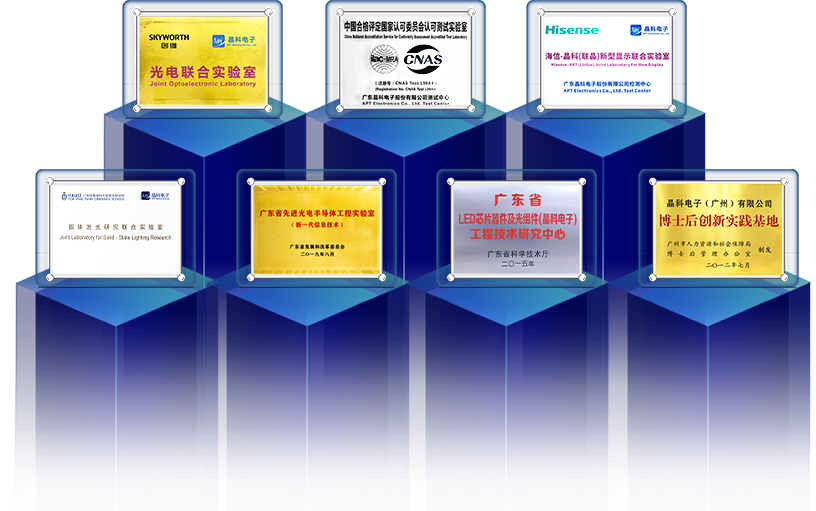 晶科电子拥有完善的自主研发体系和强大的技术创新能力。公司建有省、市二级工程技术研究中心、国家CNAS认证实验室、广东省先进光电半导体工程实验室(新一代信息技术)、广东省LED芯片器件及光组件工程技术研究中心,并分别与香港科技大学、海信及创维等共建联合实验室,配备SEM、TEM、DSC、TGA等先进表征设备。
