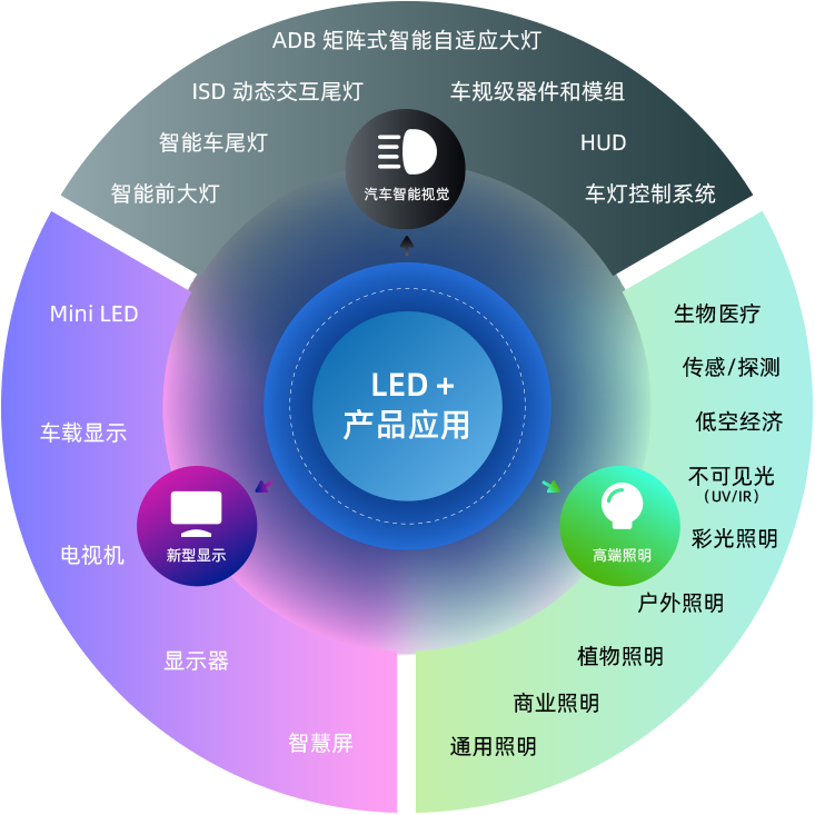 作为融合「LED+」技术的智能视觉产品及系统解决方案提供商,晶科电子构建了完整的技术生态体系,业务覆盖汽车智能视觉、新型显示及高端照明三大领域,以「LED+」技术创新为核心驱动力,深度融合集成电路、电子控制、软件算法、传感器及光学系统等前沿技术,开发了具有市场竞争力的系列产品,包括车规级 LED 器件、汽车电子模组、车载背光模组、智能车灯系统及 HUD;新型高色域薄型化背光源器件和模组、新型 Mini LED 器件和模组;高端户内外照明、智能照明、植物照明和 UV/IR 等特种照明器件和模组等。依托「LED器件-模组-系统」全产业链垂直整合,形成了从半导体封装、光学系统到终端应用的全产业链布局。