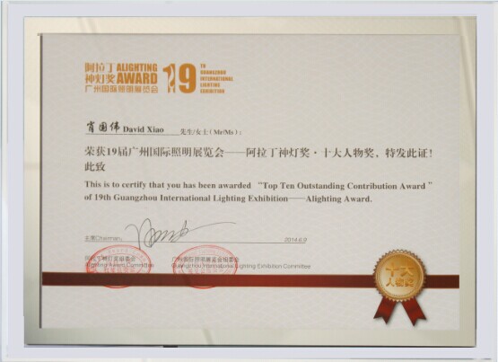 阿拉丁照明奖旨在对本年度全球照明产业绿色、节能、新技术的创新产品,光技术与艺术完美结合的杰出工程作品,以及为照明产业的发展孜孜以求的卓越人士予以嘉奖。公司总裁肖国伟博士此次得以荣登“十大人物奖”的榜单,是各级领导和广大客户对肖国伟博士在LED行业发展中所做出贡献的认可。同时,这也是对肖国伟博士带领下的晶科电子科研实力和产品的再次肯定,这不仅对我公司进一步加强创新能力建设,以全球视野力争在LED产业发展的关键领域实现重大突破,抢占LED产业发展制高点具有重要的推动作用,更为我公司的新产品研发创造了有利条件。