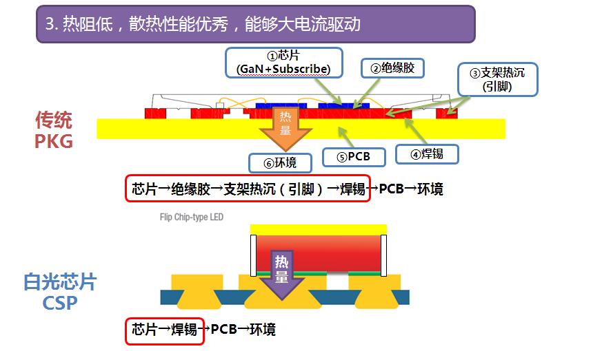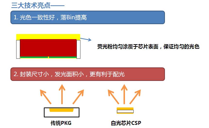 晶科电子利用白光芯片技术:晶圆级制程,无金线封装工艺,涂覆好荧光粉的LED芯片,用SMT法直接焊接到的线路基板上,逐步推出满足多层次市场需求的CSP产品。这些产品因使用了晶科专利白光芯片技术,具有如下三大技术亮点: